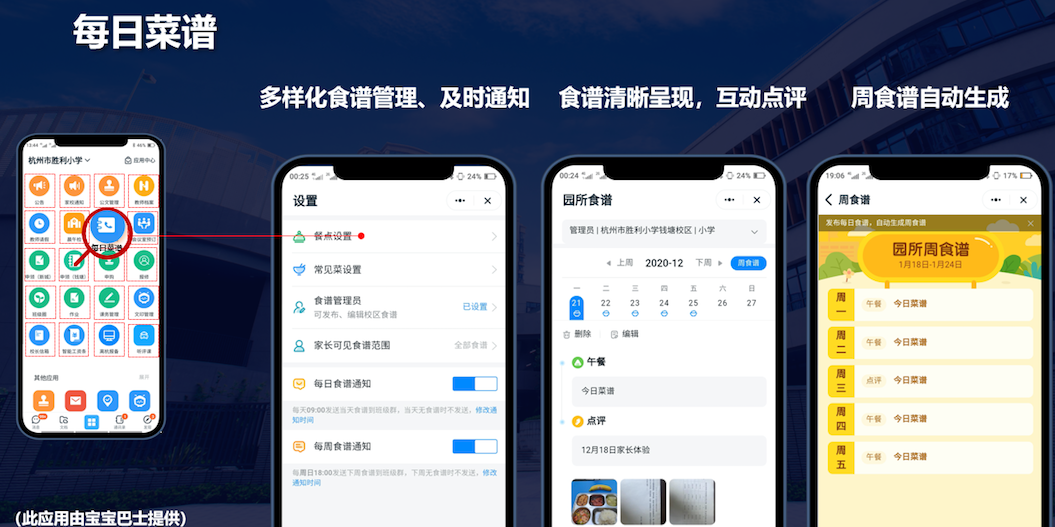 以學(xué)生就餐場(chǎng)景為例,家長(zhǎng)以前不清楚孩子每天在學(xué)校吃得怎么樣,現(xiàn)在通過(guò)“勝利釘”上的“每日菜譜”應(yīng)用呈現(xiàn)展示,家長(zhǎng)不光可以看到飯菜,還可以點(diǎn)評(píng)。如果發(fā)現(xiàn)有需要提升的地方,可以生成反饋流程直接發(fā)給相關(guān)負(fù)責(zé)人,快速得到響應(yīng)和優(yōu)化,整個(gè)過(guò)程通過(guò)數(shù)字化的方式透明公開(kāi)。