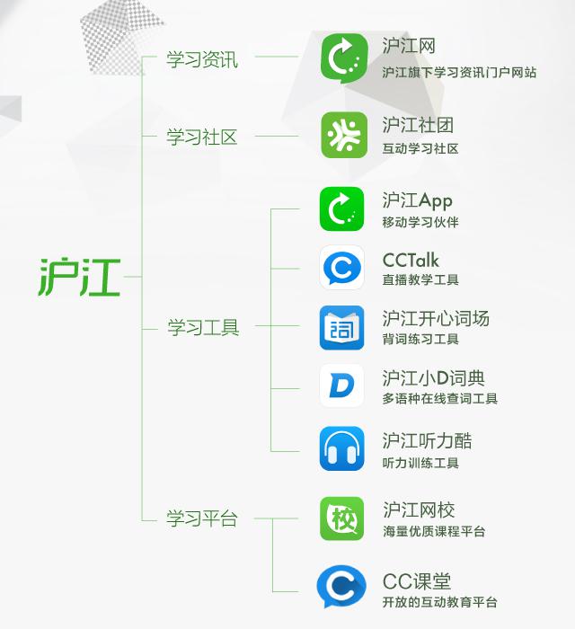 此次品牌升級之后,“滬江”將成為母品牌,旗下包含四大業(yè)務(wù)體系:滬江網(wǎng),為用戶提供學(xué)習(xí)資訊; 滬江社團,用戶的學(xué)習(xí)社區(qū);多樣的學(xué)習(xí)工具如CCTalk、開心詞場、小D詞典、聽力酷等;兩個學(xué)習(xí)平臺:錄播平臺“滬江網(wǎng)校”和直播平臺“CC課堂”。