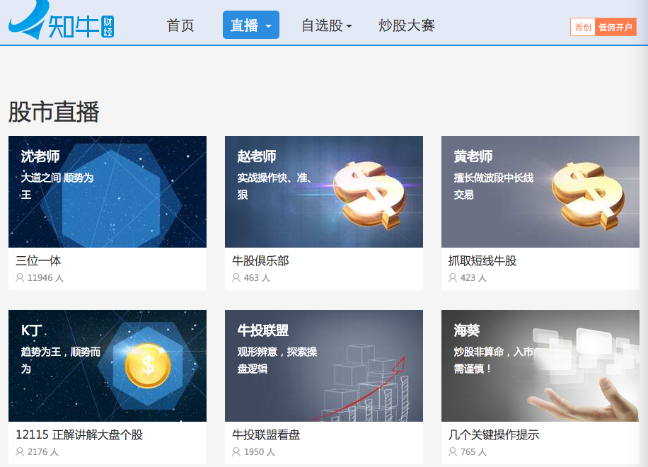 目前,知牛財經(jīng)同時開播的頻道數(shù)量超過接近4000個,每天有超過5000名財經(jīng)達人在線視頻直播,2月份平臺月活躍用戶1450萬。多知網(wǎng)登陸知牛財經(jīng)后發(fā)現(xiàn),目前,每個直播的關(guān)注人數(shù)從幾人、幾百人、幾千人到上萬人不等。