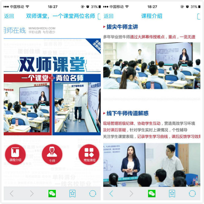 頁面顯示,雙師課堂主頁面包括“課程介紹”、“牛師”、“常規(guī)課程”。線上主講老師通過大屏幕給學(xué)生授課。除了線上主講授課老師外,每個雙師課程的課堂在線下還配有一名有多年授課和管班經(jīng)驗(yàn)老師,協(xié)助主講老師進(jìn)行課堂服務(wù)。線下老師將為學(xué)生進(jìn)行一對一服務(wù),包括答疑、針對性輔導(dǎo)、查漏補(bǔ)缺、鞏固練習(xí)等,在課前和課后還會配合主講老師進(jìn)行課后評測,布置針對性的作業(yè)并進(jìn)行批改,并記錄學(xué)生課堂表現(xiàn)和學(xué)習(xí)效果,反饋給家長。