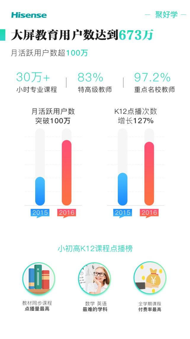 海信發(fā)布《2016互聯(lián)網(wǎng)電視白皮書(shū)》,公布其激活用戶量超過(guò)2343萬(wàn),其中大屏教育產(chǎn)品聚好學(xué)的用戶數(shù)673萬(wàn),月活躍用戶超100萬(wàn)。