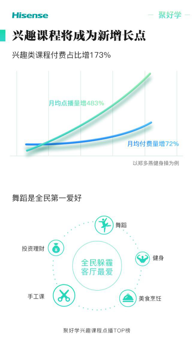 據(jù)海信方面透露,除了K12專業(yè)課程,海信聚好學(xué)的興趣課程全年付費(fèi)量同比增長(zhǎng)173%。其中鄭多燕健身操月均付費(fèi)增長(zhǎng)72%,月均點(diǎn)播量增速達(dá)到483%。