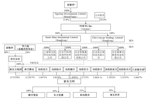 由于世紀友好持有新東方集團100%股份,俞敏洪持有世紀友好 80%股份、俞敏洪的母親李八妹女士持有世紀友好20%股份,因此,俞敏洪通過股權(quán)關(guān)系持有新東方網(wǎng)的控股權(quán)。