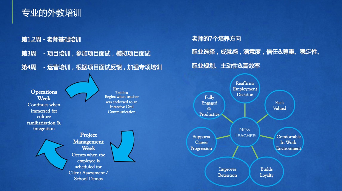 培訓(xùn)對(duì)我們來(lái)說是非常重要的環(huán)節(jié)。普通的老師在上課之前有我們會(huì)給他將近一個(gè)月的培訓(xùn)時(shí)間。第一、二周是老師基礎(chǔ)培訓(xùn);第三周的時(shí)候會(huì)進(jìn)行項(xiàng)目培訓(xùn),并且會(huì)參加項(xiàng)目面試和模擬項(xiàng)目面試;到了第四周,我們會(huì)對(duì)老師進(jìn)行運(yùn)營(yíng)培訓(xùn),并且根據(jù)項(xiàng)目面試的反饋,加強(qiáng)專業(yè)培訓(xùn)。