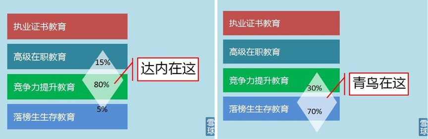 那么達(dá)內(nèi)的學(xué)生出路天然一定比北大青鳥要好(本身素質(zhì)較高),達(dá)內(nèi)的口碑自然就更好,品牌自然就顯得更加高大上,所以培優(yōu)的差異化市場選擇使達(dá)內(nèi)有機會從職業(yè)教育的紅海中殺出一條血路。
