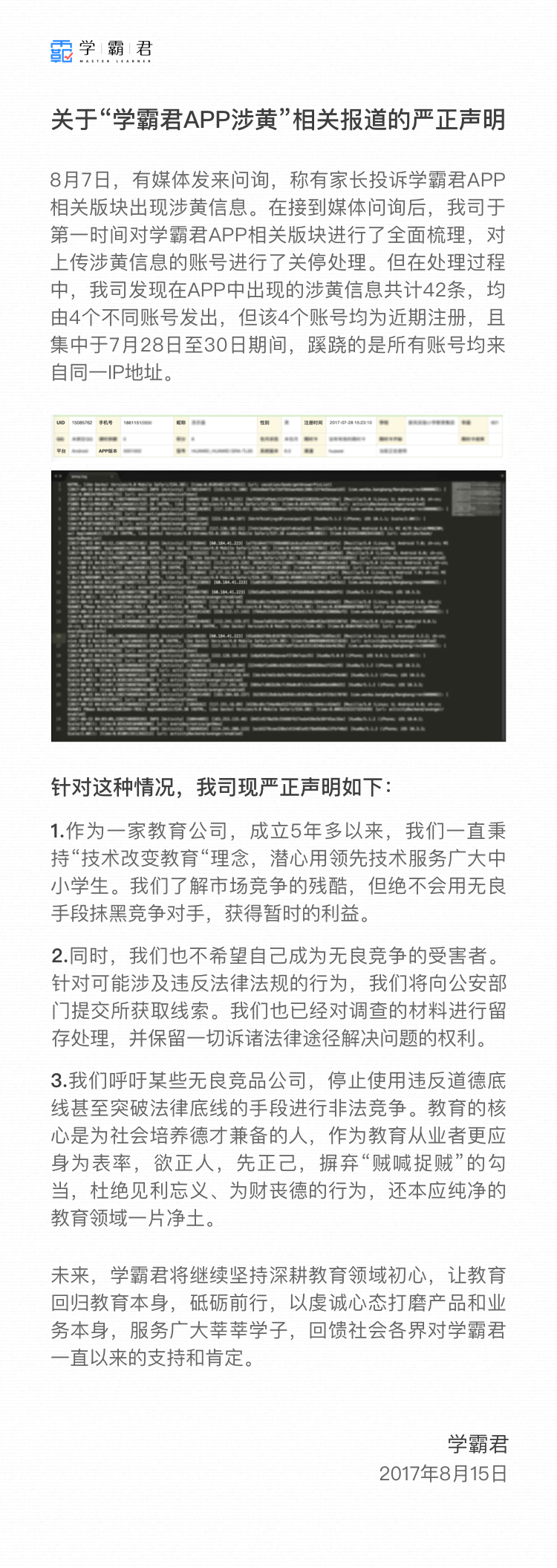 多知網(wǎng)8月15日消息,今日,學(xué)霸君對APP涉黃事件發(fā)布聲明。聲明稱,APP中出現(xiàn)的共計(jì)42條涉黃信息,均來自4個近期集中注冊的不同賬號,且所有賬號均來自同一IP地址,初步懷疑是競爭對手惡意攻擊。