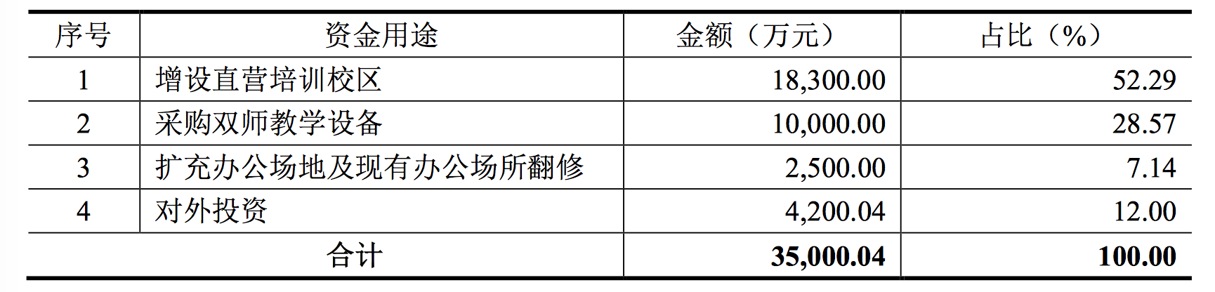 公告披露,本次股票發(fā)行募集資金扣除發(fā)行費用后,主要用于增設直營培訓校區(qū)、采購雙師教學設備、擴充辦公場地及現(xiàn)有辦公場所翻修和對外投資等。資金用途擬安排如下: