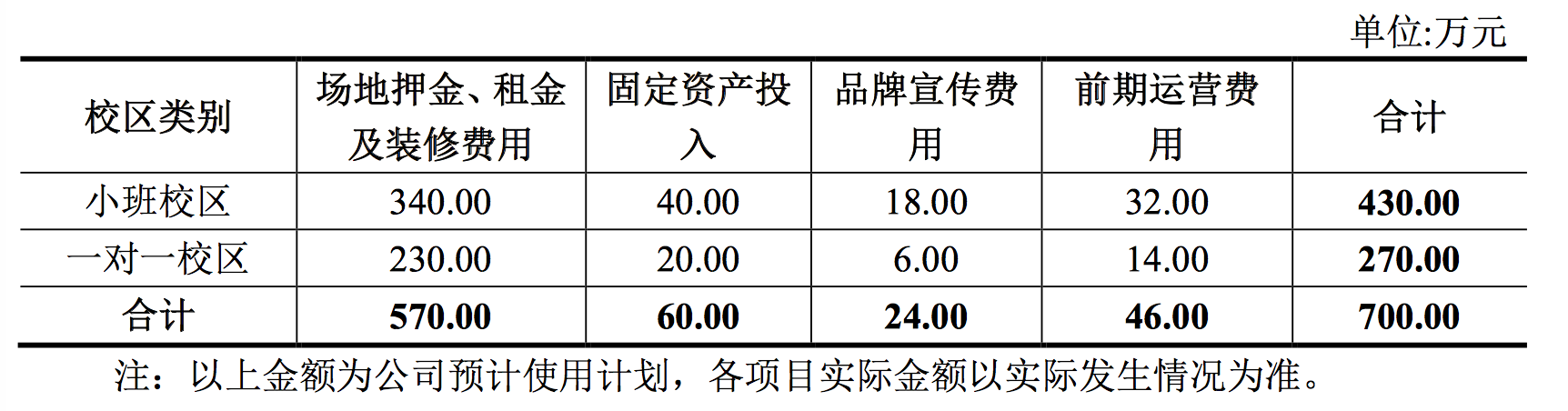 公告還披露,高思將在 2 年內(nèi)有計劃、有步驟地在北京開設新的直營培訓校區(qū)。預計在2年內(nèi)增設30個小班教學校區(qū)和20個一對一教學校區(qū)。單個直營培訓校區(qū)的 設立成本具體構(gòu)成如下: