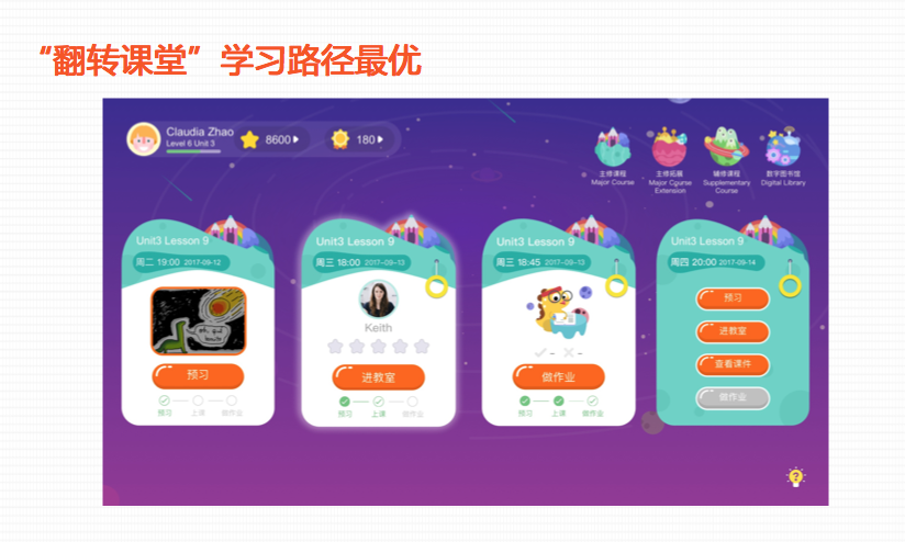 “翻轉(zhuǎn)課堂”設計課前預習、進教室、做作業(yè)等環(huán)節(jié),孩子在進入VIPKID主修課環(huán)節(jié)時,系統(tǒng)會自動推薦對應的課前預習視頻、課后作業(yè),以及對應級別的輔修課程、公開課、自編繪本和分級讀物等,幫助孩子設置優(yōu)化的學習路徑;