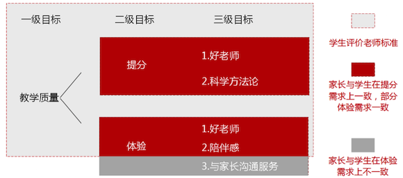 一家教育培訓公司的收入來自家長為孩子的付費,成本包括支付教師工資、營銷獲客和其他運營支出(固定資產(chǎn)、租金等),其中前兩項又占最大比例。然而 K12 教育培訓是一個非常獨特而復雜的行業(yè),從滿足供需匹配的角度看,教育培訓公司終極的目標是提供高質量的教學服務。但教學質量的評判不是簡單的一個可量化結果,進一步拆解這一目標其實可分解為兩部分,第一是達到幫助學生提分這一個結果,第二是用戶使用服務過程中有好的體驗。接下來所有分析的模式,都可以套用到這一框架里進行分析。