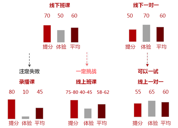 套用到提分和體驗兩個維度的分析框架中,用一張簡單的打分圖來綜合看,線上的模式在未來推進的可行性和空間。