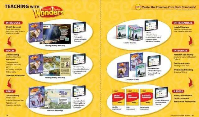 “Wonders”是全球第一套根據(jù)美國最新共同教育大綱(CCSS)編寫的核心教材,是此前美國主流小學教材Treasures的升級版。從2013年開始,Wonders已全面替代舊版Treasures教材。目前在美國加州,Wonders是學校用于課堂母語教學的主要課本(其功能相當于國內(nèi)中小學語文教材)。按照要求,學員在學完Wonders整套課程之后,能夠達到美國教育部要求的美國中學生閱讀水準。而從2014年開始, SAT(美國高考)和IBT托福考試的閱讀難度將與新大綱要求的閱讀水準一致。