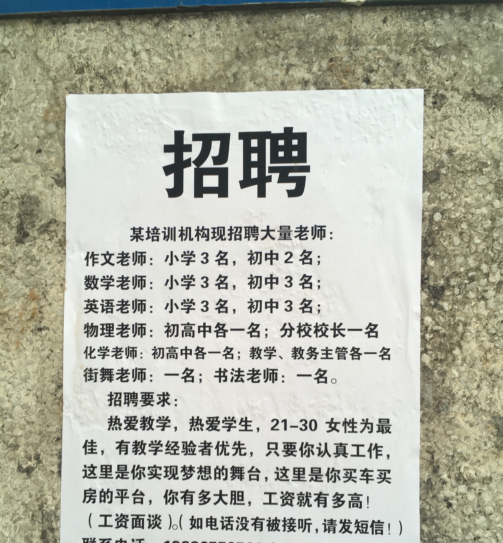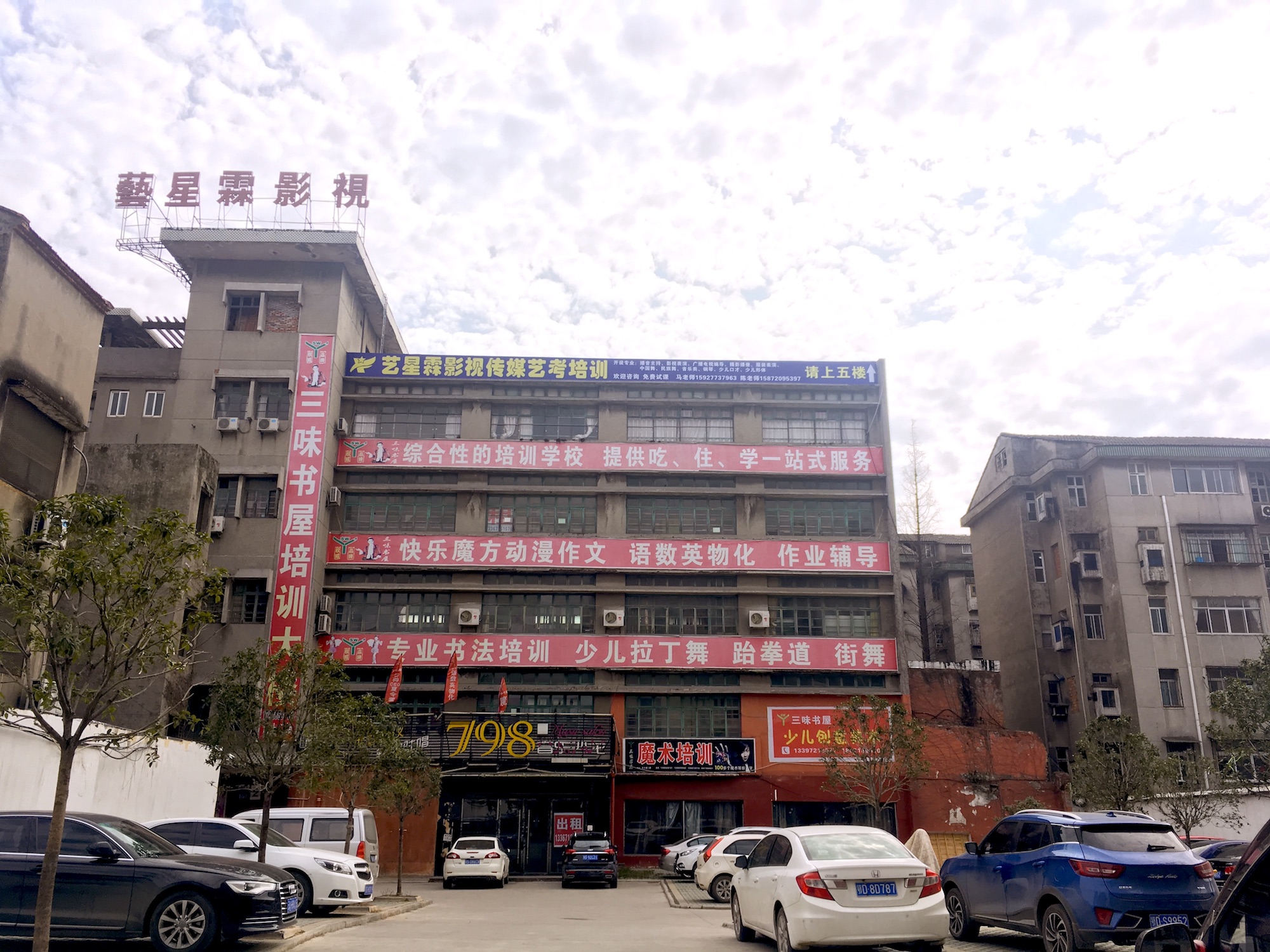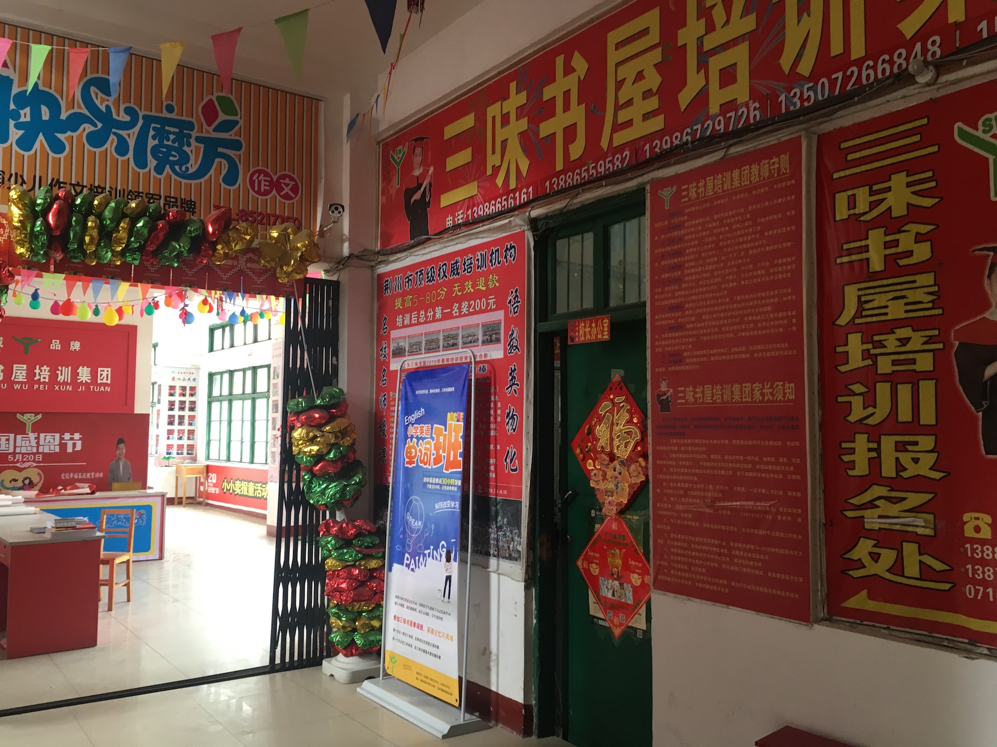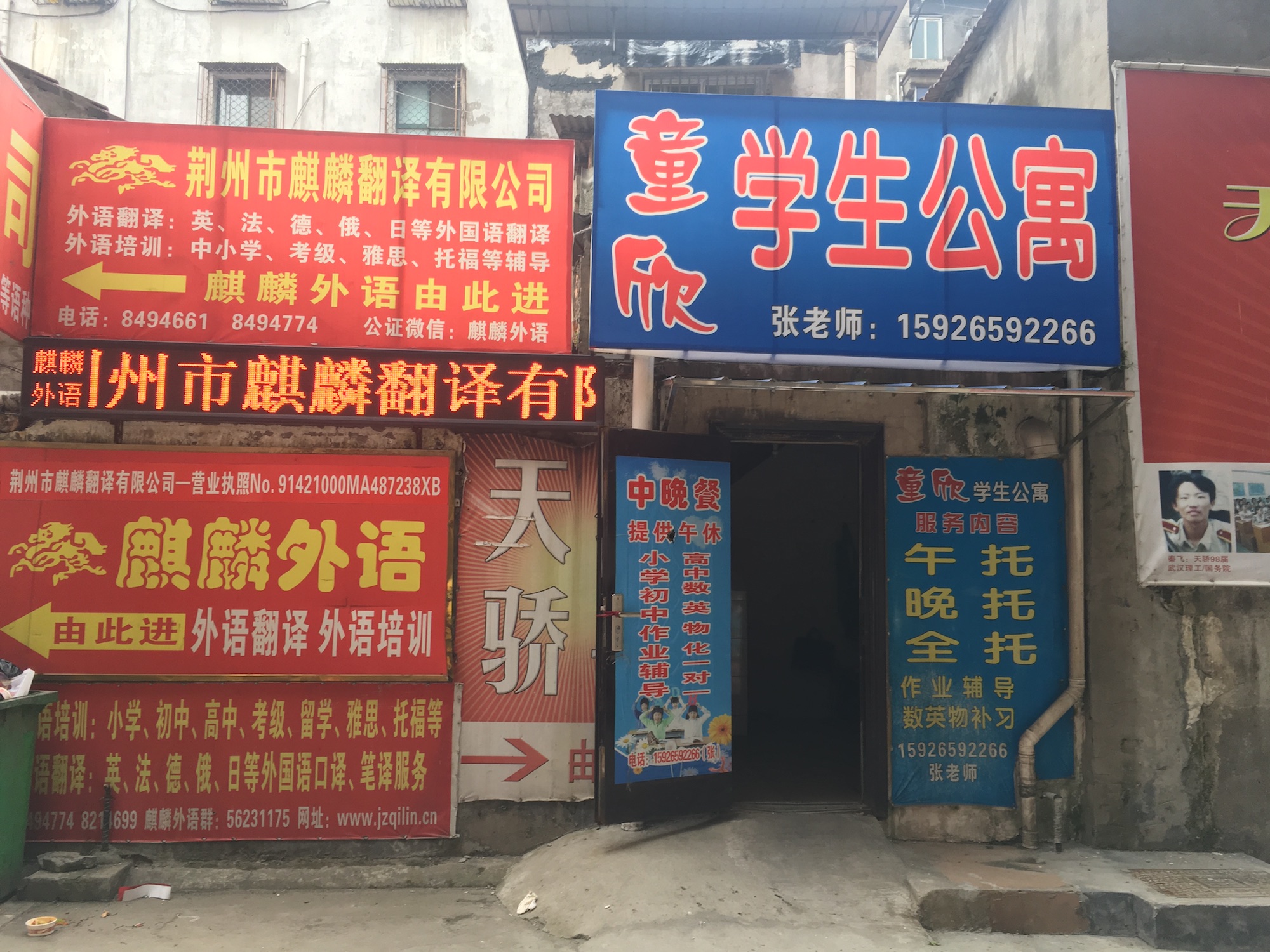 商家聚集在荊州中路,但隔著兩家店也就能看見一家“某某教育”的招牌,古城里都是老房子,這里的店面大多十來平米,臨街的機構(gòu)少,機構(gòu)的真正所在地都深入店面背后的老居民樓,但會在街面留個招牌,有的機構(gòu)為了顯示其排場,幾個大大的粗體字分布在5層樓高的樓面上。