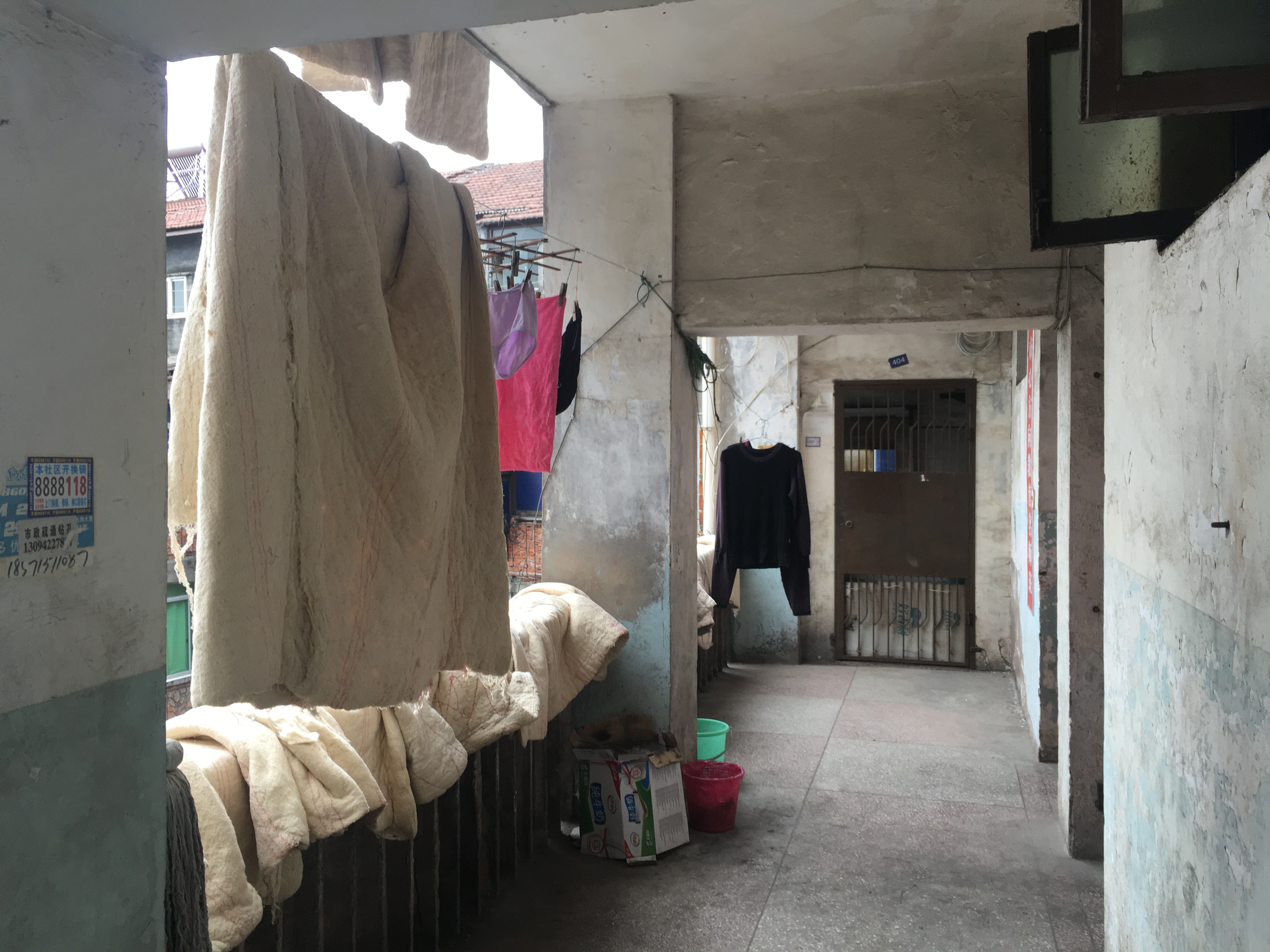 右拐,左拐,上樓,再拐,走到頭,這里曬著幾床大棉絮,頂頭鐵門里,一條鮮紅的招牌打破了老樓的沉寂——“荊州某教育名師班”。而背后便是另一家學生公寓。