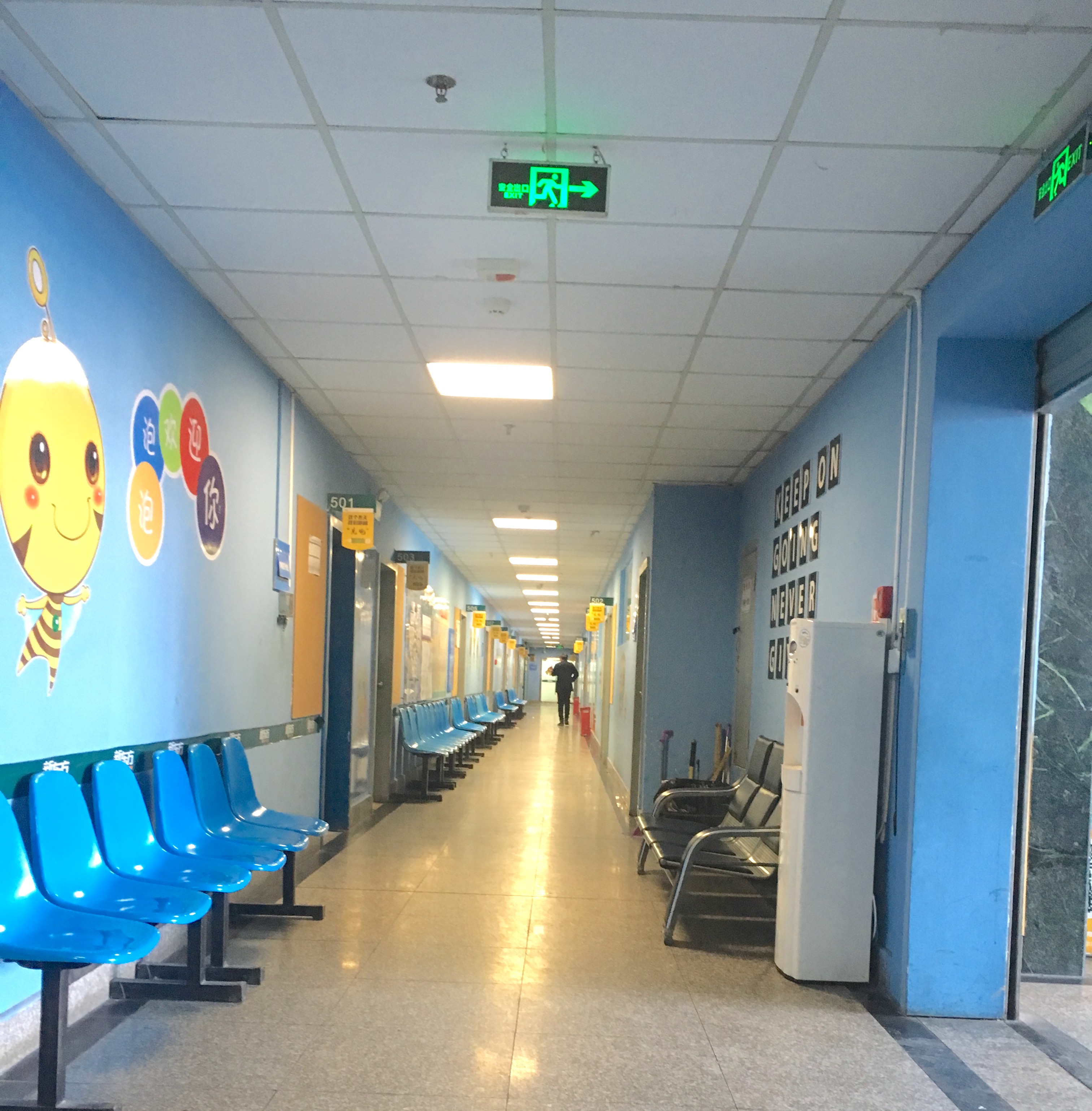 五樓,共有17間教室。藍色的樓道主題色,教室里是統(tǒng)一的綠色調(diào)的裝潢。