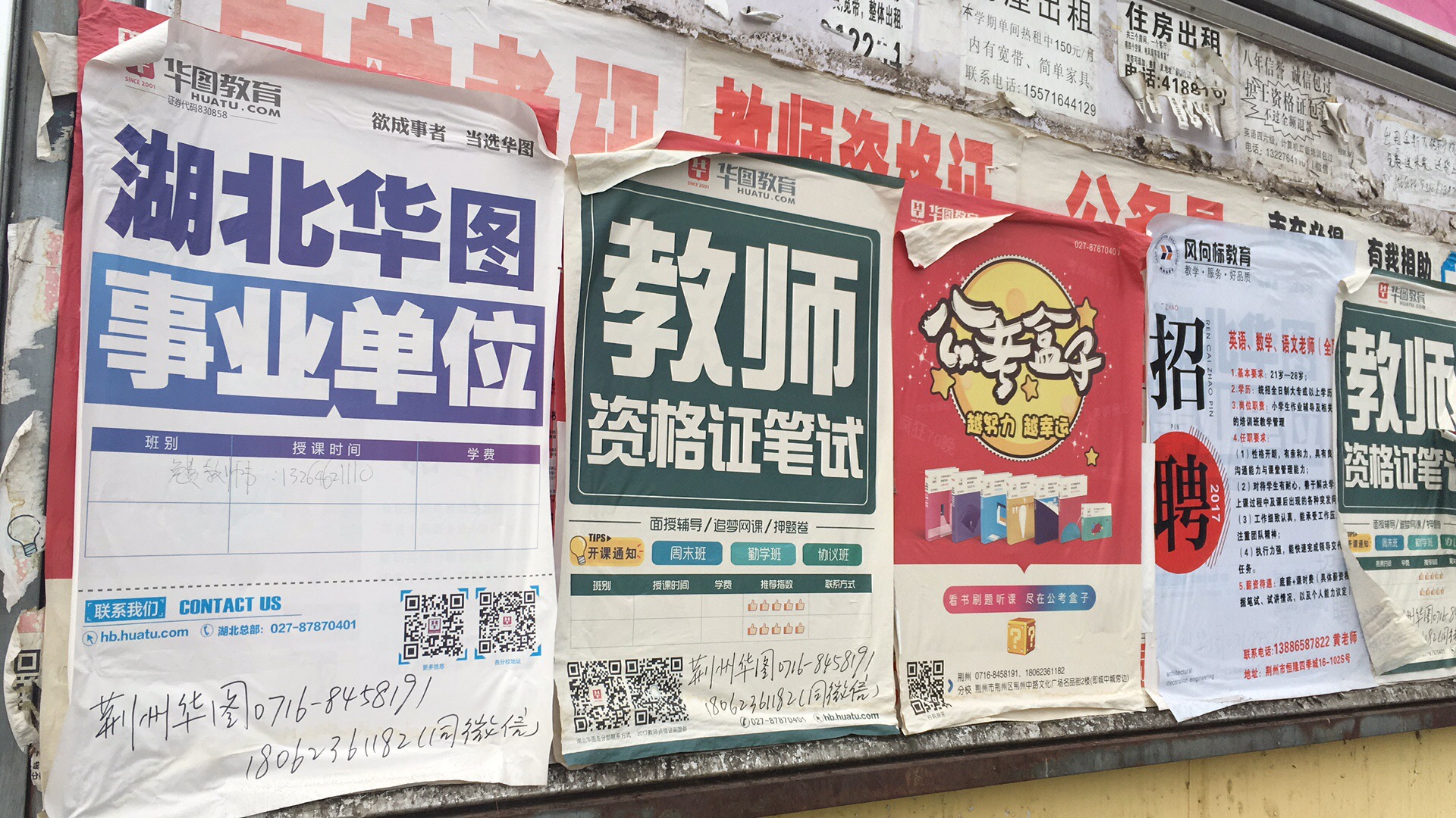 在K12以外,長江大學文理學院里,華圖教育占據(jù)了宣傳欄的半壁江山。其他便是培訓機構(gòu)的招聘信息。