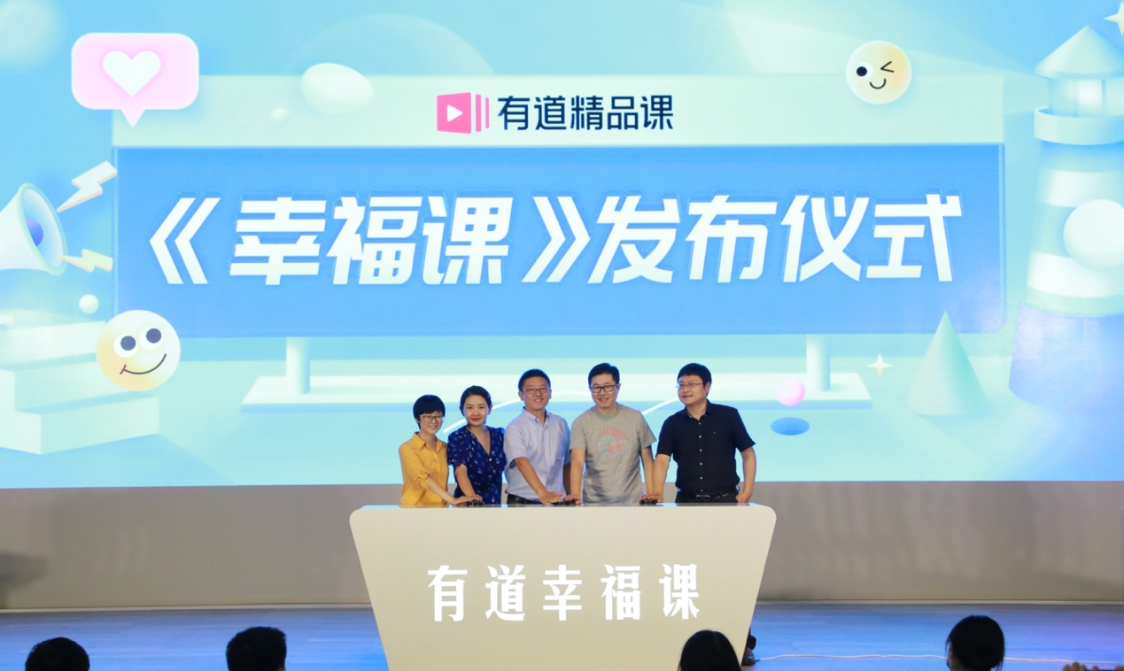 (圖左至右:網(wǎng)易有道高級副總裁、有道精品課負責人羅媛;清華大學腦與智能實驗室研究員高楊;清華大學社會治理與發(fā)展研究院培訓師賈新超;網(wǎng)易有道CEO周楓;清華大學社會科學學院發(fā)展辦主任張新華共同發(fā)布青少版《幸福課》)