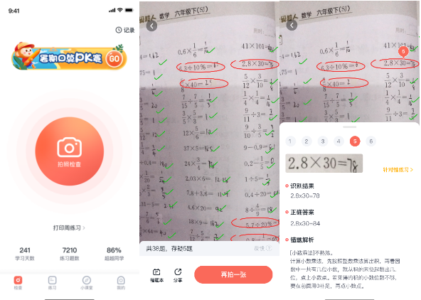“小學(xué)口算”APP主要通過人工智能圖像識(shí)別技術(shù)來完成對孩子作業(yè)的檢查,根據(jù)家長和老師拍的口算作業(yè),系統(tǒng)能夠自動(dòng)掃描所有題目及答案,智能生成檢查報(bào)告,并且提供錯(cuò)題答案和解析。目前,“小學(xué)口算”的用戶平均每天拍照批改作業(yè)5次以上,APP每月批改的題目累計(jì)超3億道。