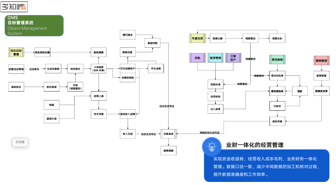 我們還有預(yù)算管理,把預(yù)算進(jìn)行分解,分解到各個(gè)環(huán)節(jié)以后,我們有教材的管理、租賃的管理、人力薪酬的管理和費(fèi)用包銷、工程裝修資產(chǎn)的管理,這些都會(huì)生成相關(guān)的憑證到財(cái)務(wù),就實(shí)現(xiàn)了財(cái)務(wù)一體化,減少中間的加工環(huán)節(jié),提高數(shù)據(jù)的精準(zhǔn)度。