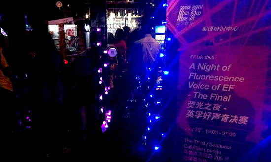 上周六,第一屆“英孚好聲音”英語唱歌比賽的決賽在上海市烏魯木齊路的一家酒吧里進(jìn)行,13名選手各施所長,最后由一位陸家嘴學(xué)校的學(xué)員贏得桂冠。