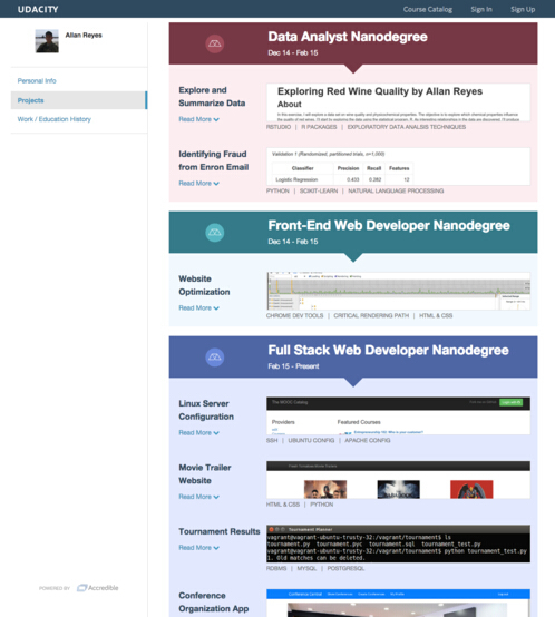 目前,Accredible正在與不同的在線教育平臺展開合作將其服務(wù)范圍逐步擴(kuò)大。今年2月底,Accredible剛剛與免費在線課程平臺Saylor Academy達(dá)成合作,而近日又傳出了它和美國三大課程提供商之一Udacity的合作,對其Nanodegrees項目課程提供學(xué)習(xí)證明。