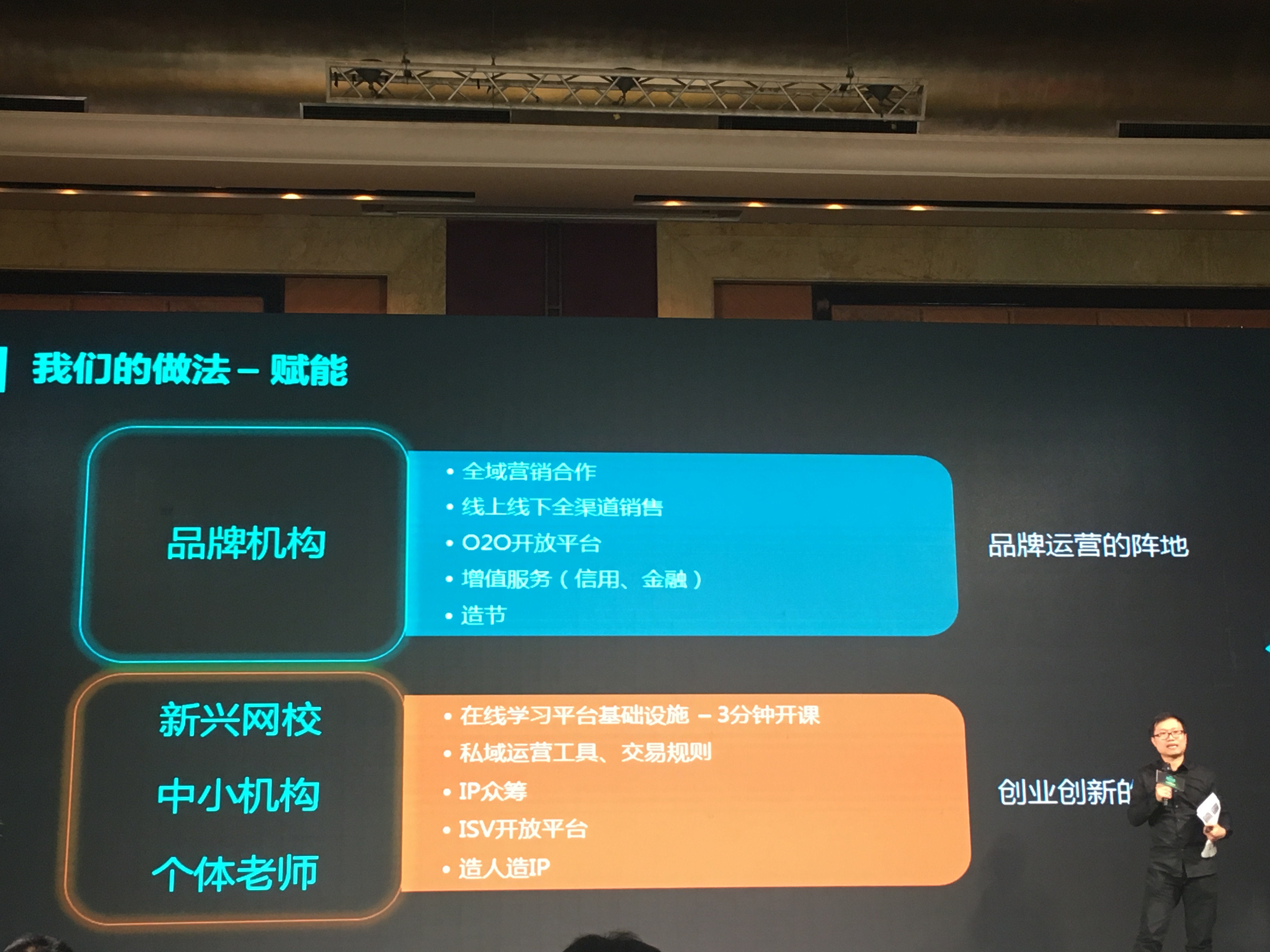 對(duì)新興網(wǎng)校、中小機(jī)構(gòu)、個(gè)體老師,將會(huì)提供在線學(xué)習(xí)平臺(tái)基礎(chǔ)設(shè)施、私域運(yùn)營(yíng)工具、IP眾籌、ISV開(kāi)放平臺(tái)、人造IP等方式支持他們的發(fā)展。