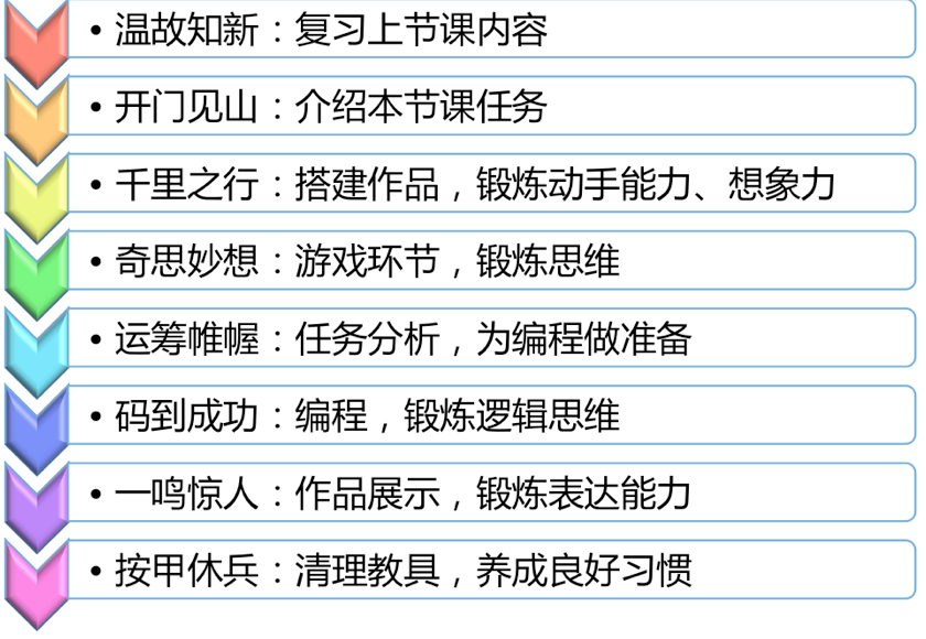首先說我們的課堂環(huán)節(jié),我還是以少兒機器人的課堂為例,我們每堂課包含8個標準環(huán)節(jié):溫故知新,復(fù)習(xí)上節(jié)課的內(nèi)容;開門見山,介紹本節(jié)課的任務(wù);千里之行,搭建作品;奇思妙想,我們會做游戲,以此來鍛煉學(xué)生的抽象邏輯思維能力,發(fā)散性思維能力,逆向思維能力等等,來為編程做準備;第五個環(huán)節(jié)運籌帷幄就是任務(wù)分析,為編程做個思路,畫流程圖;第六個碼到成功,就是要做編程了。第七一鳴驚人,我們要做作品展示;最后按甲休兵,清理教具。我們在整個視頻過程中,把這8個環(huán)節(jié)固化起來。