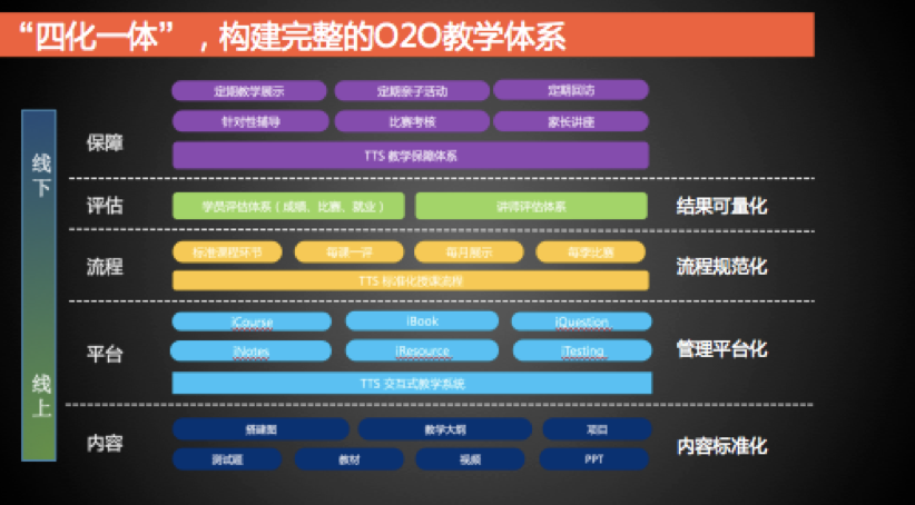 光有了完善的課程體系還不夠,要想把整個教學(xué)做好,我們還需要配套的教學(xué)系統(tǒng),我們起了一個名字叫四化一體:教學(xué)內(nèi)容標準化、過程規(guī)范化、管理平臺化、結(jié)果可量化,再加上線上線下一體化,接下來我會一個一個介紹。