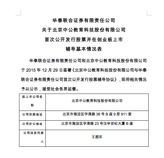 據中國證監(jiān)會官網顯示,華泰證券作為輔導機構,于2015年12月29日與中公教育簽署《輔導協(xié)議》,并于2015年12月29日完成輔導備案登記,開始了對中公教育首次公開發(fā)行股票并在創(chuàng)業(yè)板上市的輔導工作。