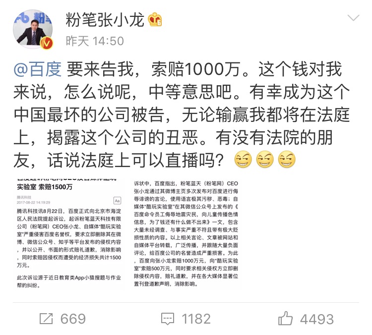 8月21日下午2點,百度通過三方宣布,向北京市海淀區(qū)人民法院提起訴訟,起訴粉筆科技CEO張小龍、自媒體 “酷玩實驗室”嚴重侵害百度名譽權。并向張小龍、“酷玩”共計索賠1500萬元。