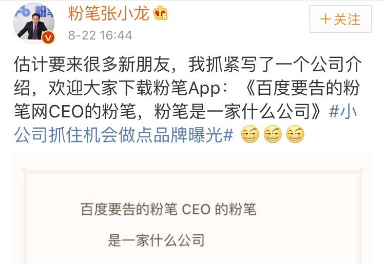 下午4點,張小龍在微博上發(fā)出《百度要告的粉筆網(wǎng)CEO的粉筆,粉筆是一家什么公司》的品牌文案,鼓勵看客們與其關注事件本身,不如下個粉筆App。