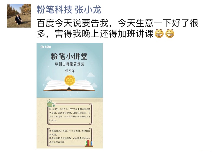 下午7點半,張小龍再次發(fā)微信:“因為百度的折騰,讓他學員多了不少,還得加班講課?!笔潞笄笞C此事時,他透露雖無法給出因為這場大戲而為粉筆帶來的直接效益,但是他的微博粉絲,的確又漲了不少。