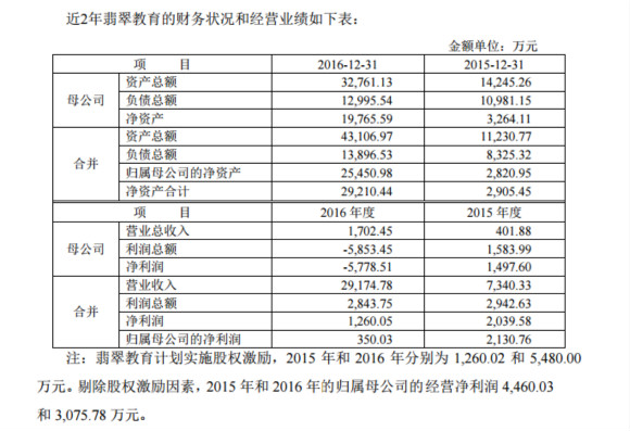 翡翠教育2015年和2016年的營業(yè)收入分別為7340萬元、2.92億元,凈利潤分別為1260萬元,2040萬元,歸屬母公司的凈利潤分別為2131萬元、350萬元。