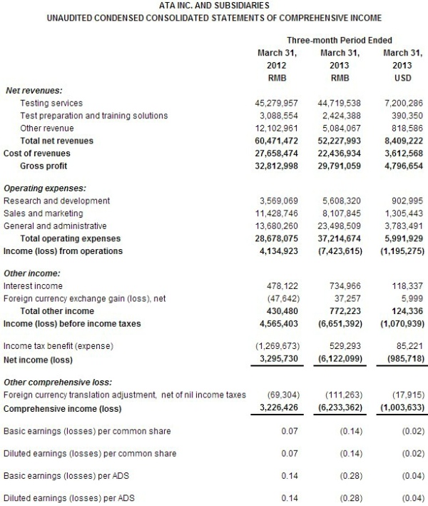 ATA今日凌晨公布了截止2013年3月31日的2013財年四季度財報:當(dāng)季營收840萬美元,同比降1.2%。凈虧損99萬美元,去年同期凈利潤330萬美元。