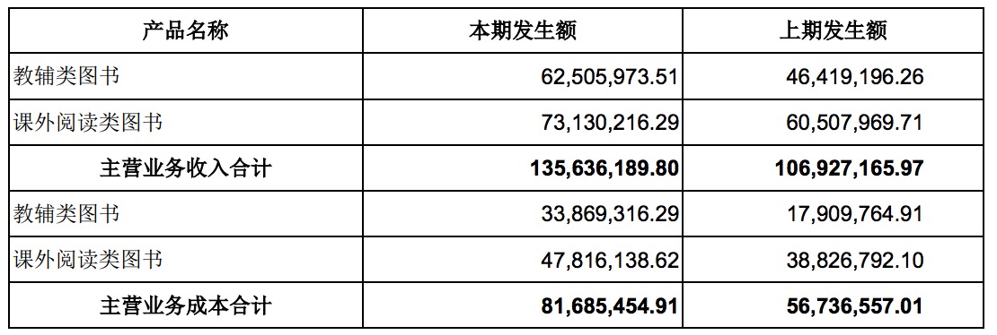 如上表所示,教輔類圖書本期發(fā)生額約為6250.6萬元,約占主營業(yè)務(wù)收入的46.09%,同比增長34.66%;課外閱讀類圖書本期發(fā)生額為7313.02萬元,占主營業(yè)務(wù)收入53.91%,同比上漲20.86%,教輔類圖書收入與課外閱讀類圖書的收入額占比大致相同。