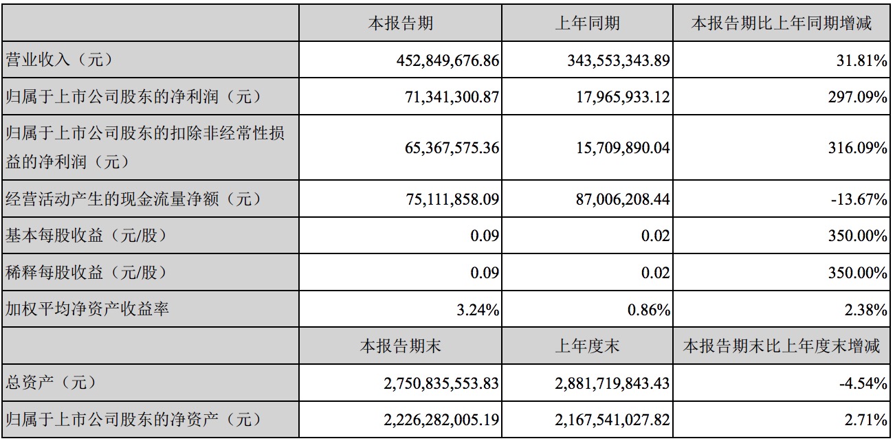 報告顯示,營業(yè)收入4.53億元,同比增長31.81%;歸屬于上市公司股東的凈利潤7134.13萬元,同比增長297.09%。