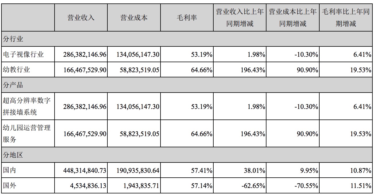如表所示,威創(chuàng)股份的主營業(yè)務(wù)分行業(yè)、產(chǎn)品、地區(qū)。其中,幼教行業(yè)營業(yè)收入1.66億元,同比增長196.43%;毛利率64.66%,同比增長19.53%;幼兒園運營管理服務(wù)與之相同。