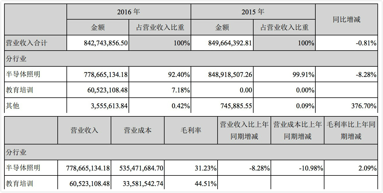 報(bào)告表明,2016年勤上光電教育培訓(xùn)營收6052.31萬元,占營業(yè)收入7.18%,營業(yè)成本3358.15萬元,毛利率44.51%。