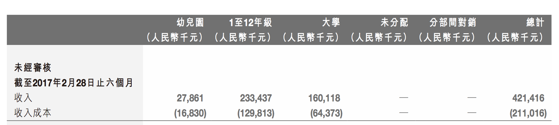 多知網(wǎng)5月31日消息,今日,宇華教育發(fā)布中期報(bào)告。截至2017年2月28日的六個(gè)月,總營收4.21億元,較同期增長8%;主要是由于在校人數(shù)及學(xué)費(fèi)增加。