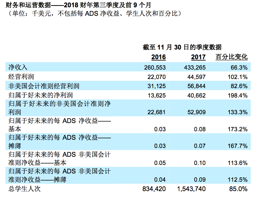 2018財年前9個月的總學生人次從上年同期的約2,598,120增長到約4,833,880,同比增長86.1%。
