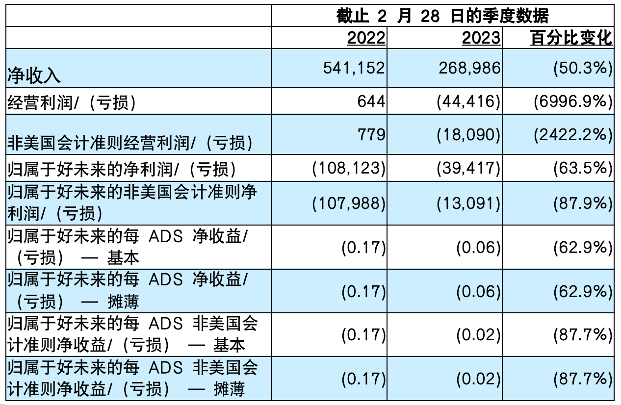 2023財年歸屬于好未來的凈虧損為1.356億美元,而2022財年歸屬于好未來的凈虧損為11.361億美元,歸屬于好未來的非美國會計準則凈虧損為2700萬美元,而去年同期歸屬于好未來的非美國會計準則虧損為9.613億美元。