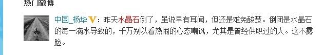 3月26日,認(rèn)證信息為香港華視界動漫國際有限公司董事長的“中國-楊華”在新浪微博對水晶石出現(xiàn)的重大危機進行了進一步證實。稱“昨天水晶石倒了,雖說早有耳聞,但還是難免酸楚。倒閉是水晶石的每一滴水導(dǎo)致的,千萬別以看熱鬧的心態(tài)嘲諷,尤其是曾經(jīng)供職過的人。這不露臉。”