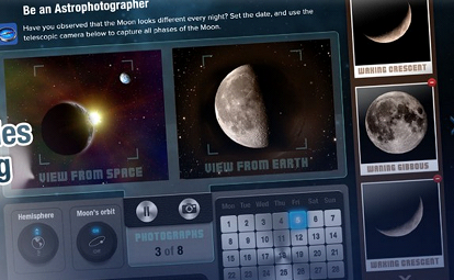 在理解月相的時候,學(xué)生會站在天文攝影家的角度,使用變焦鏡頭拍下各種月相。而且每個學(xué)生都可以通過改變自己的坐標(biāo)和時間,來試驗不同的月相,把照片按順序排好。