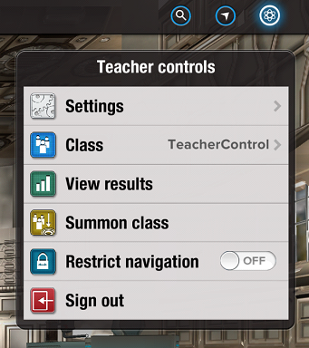 為了更好地保障學(xué)習(xí)效果,IntoScience強調(diào)老師在課堂中的主導(dǎo)地位。在老師控制界面,有查看成績(View results)、召喚班級(Summon class)、限制導(dǎo)航(Restrict nagivation)三個主要功能。通過View results,老師可以實時查看學(xué)生成績;為了所有學(xué)生都能參與進(jìn)來,老師可以使用Summon class,無論學(xué)生正在做什么,都會馬上回到指定活動;Restrict nagivation限制學(xué)生的活動區(qū)域,對他們的每一步行動進(jìn)行課程指引,保證他們進(jìn)入特定的學(xué)習(xí)領(lǐng)域。