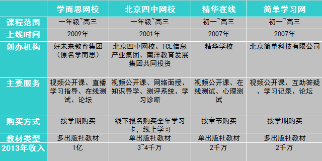 北京四中網(wǎng)校:北京四中網(wǎng)校是由北京四中、TCL信息產(chǎn)業(yè)集團(tuán)、南洋教育發(fā)展集團(tuán)共同投資組建。2001年上線,2013年收入約3~4千萬。