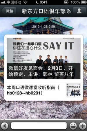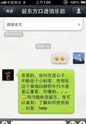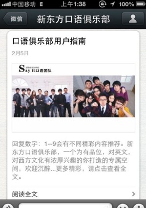 口語(yǔ)俱樂(lè)部這個(gè)公眾微信是我在2012年暑假結(jié)束后建立的,建立的原因是我覺(jué)得用微博的大學(xué)生其實(shí)沒(méi)有那么多,但是用微信的學(xué)生卻很多,官方微信到現(xiàn)在一年的時(shí)間,微信粉絲增加到了30000多人,我們每天給大家發(fā)送的各種口語(yǔ)內(nèi)容得到了學(xué)員很好的反饋,每天能收到幾千條的微信回復(fù),很好地培養(yǎng)了學(xué)員粘度。以下是我對(duì)如何做好語(yǔ)言學(xué)習(xí)類(lèi)公眾微信的分析,案例都是我們口語(yǔ)俱樂(lè)部的例子,寫(xiě)得不好的地方,請(qǐng)各位批評(píng)指正。