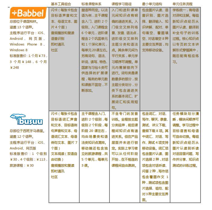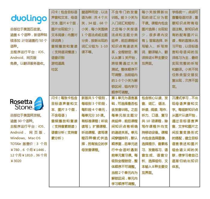 最后,以表格的形式,對(duì)Babbel、Busuu、Duolingo這幾個(gè)千萬(wàn)級(jí)用戶量的語(yǔ)言學(xué)習(xí)系統(tǒng)產(chǎn)品進(jìn)行簡(jiǎn)單比較——當(dāng)然,作為參照的也少不了PC軟件時(shí)代的標(biāo)桿Rosetta Stone。從當(dāng)年的Auralog,到Livemocha,再到Duolingo以及大量新涌現(xiàn)的語(yǔ)言學(xué)習(xí)應(yīng)用,幾乎每次強(qiáng)有力的挑戰(zhàn)者都以“我們比Rosetta Stone更值得選擇”來(lái)為自身的學(xué)習(xí)效果背書(shū),足見(jiàn)其在這一領(lǐng)域深入人心的程度。