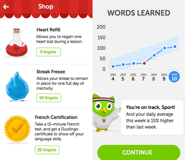 Duolingo去年晚些時候推出了iOS版本應(yīng)用的升級,引入游戲化虛擬商店,用戶可以從商店中購買虛擬物品,讓使用過程更加個性化,購買使用一種名叫“Lingots”的虛擬貨幣,可以通過Duolingo中通過一定學(xué)習(xí)通關(guān)得到。Von Ahn表示引入這樣的游戲元素時為了讓Duolingo變得更為有趣。