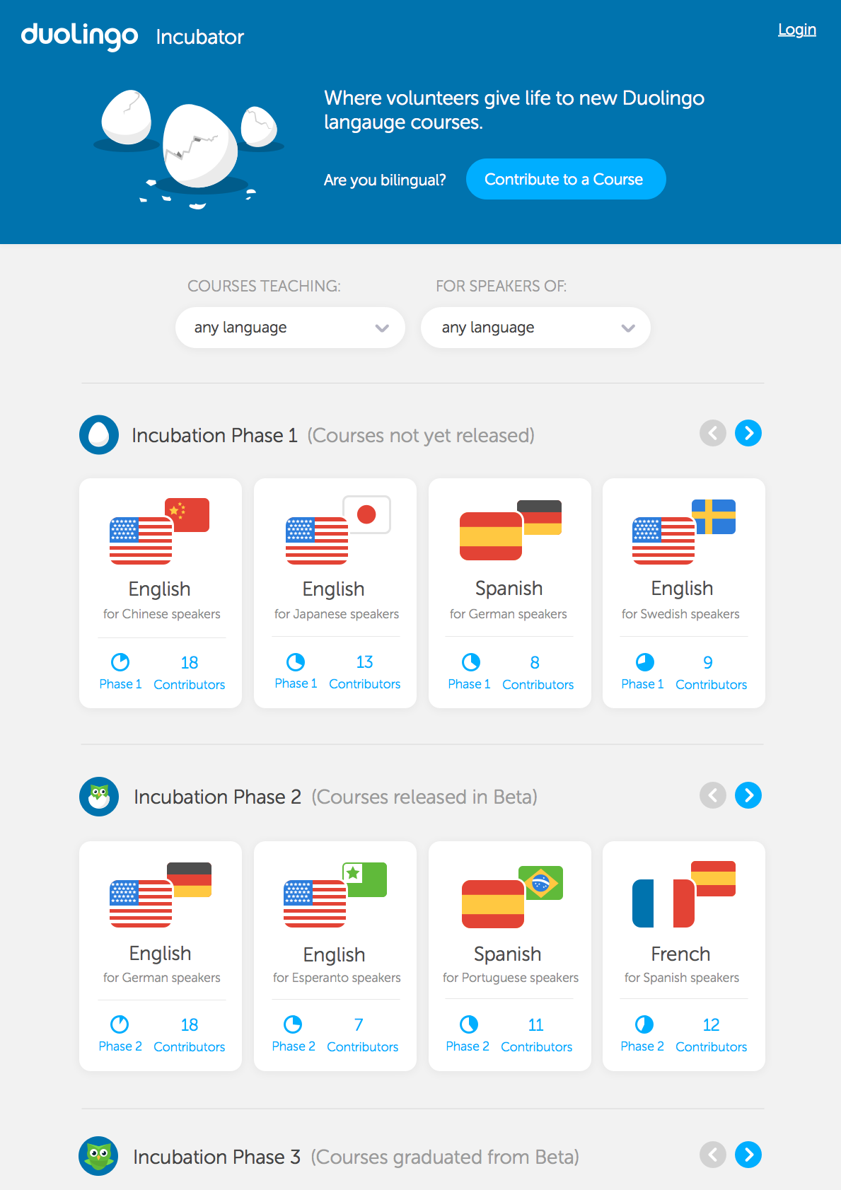 Duolingo課程來自Duolingo社區(qū),源自去年10月份推出的一個眾投項目,名叫“語言孵化器”(Language Incubator),讓說母語的人或語言愛好者按照Duolingo的標(biāo)準(zhǔn)來設(shè)計課程。