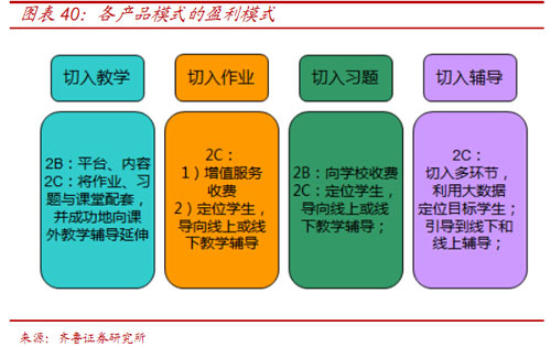 培訓(xùn)輔導(dǎo):課外輔導(dǎo)機(jī)構(gòu)或者家教 1:1 等輔導(dǎo)產(chǎn)品的目的就是為學(xué)生提供額外的教學(xué),幫助學(xué)生提高。而隨著大數(shù)據(jù)時(shí)代的到來,定位學(xué)生的薄弱環(huán)節(jié),變得容易。而定位學(xué)生薄弱環(huán)節(jié)主要通過輔導(dǎo)學(xué)生解題和提供習(xí)題庫的過程中產(chǎn)生,因此目前輔導(dǎo)機(jī)構(gòu)亦在通過題庫、解答作業(yè)等產(chǎn)品形態(tài)去切入市場。此外,輔導(dǎo)機(jī)構(gòu)的教學(xué)過程正在向數(shù)字化和在線化方向改變。此產(chǎn)品模式的領(lǐng)先廠商分別為好未來、學(xué)大教育和新東方。
